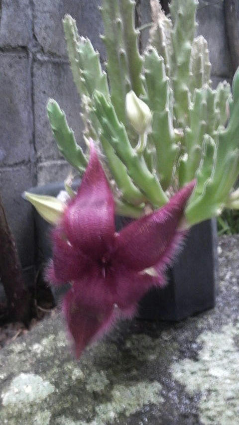 玄関に置いてある、サボテンの一種と思われる植物に花が咲きました d=(^o^)=b