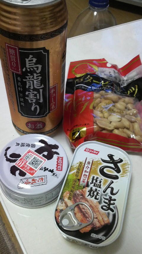 で、マンションにたどり着き、本日は、ママか送ってくれたおつまみでイッパイ(^_^)/□